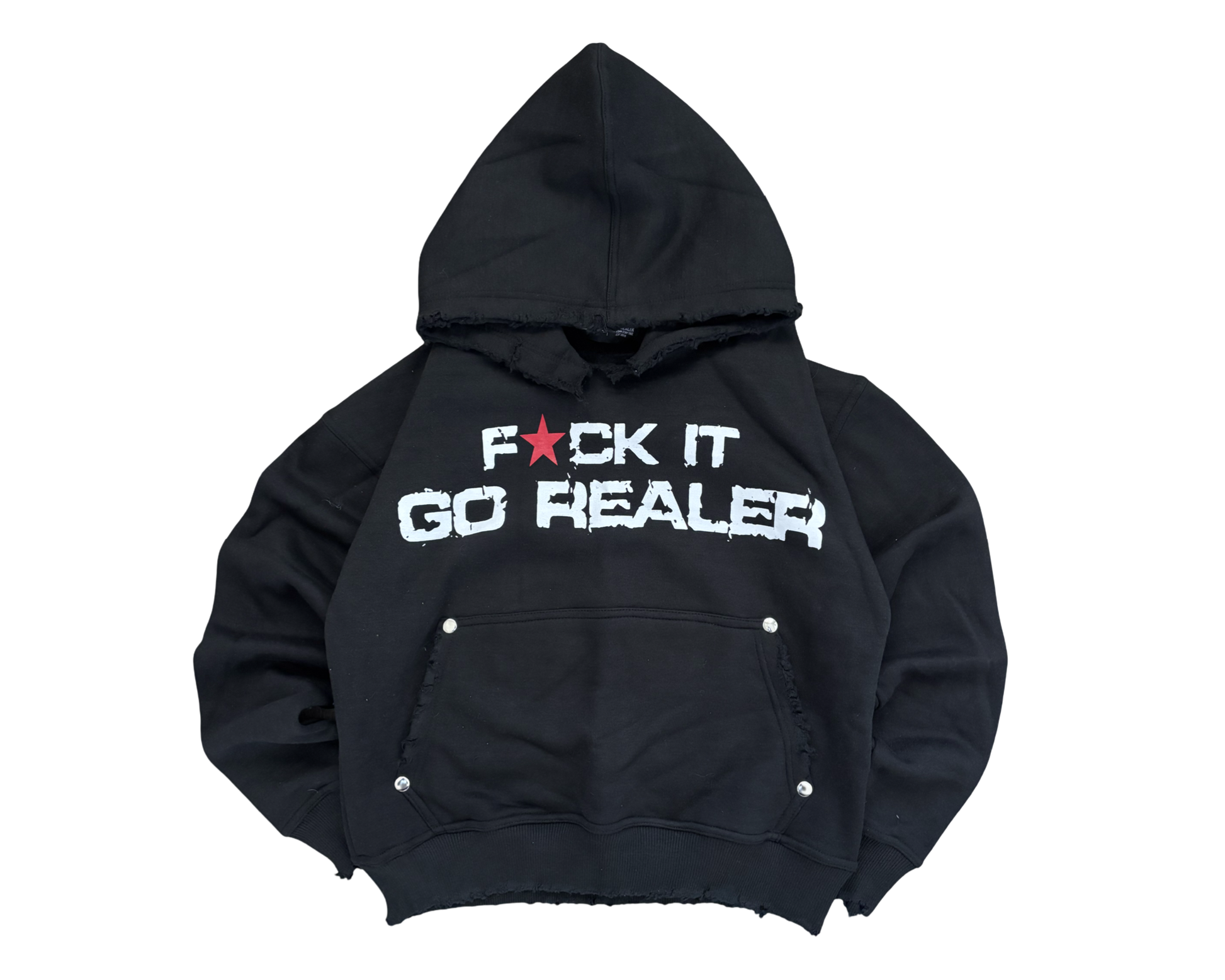 The FCK IT GO REALER Hoodie features heavyweight 400 GSM cotton and subtle silver cap studs on the pockets designed for presence, built for real ones.
